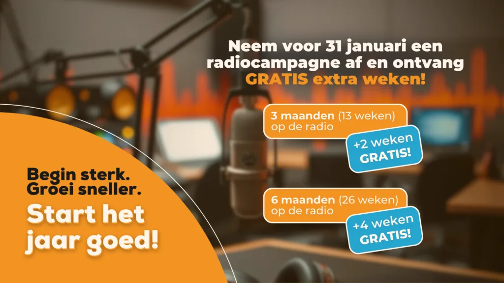 Begin het jaar goed met een campagne op de radio. In januari ontvang je bij een campagne van 3 of 6 maanden extra zendtijd zonder extra kosten.* Kies je voor 3 maanden, dan krijg je 2 weken gratis. Bij een campagne van 6 maanden krijg je zelfs 4 weken gratis adverteren erbij! De actie loopt tot 31 januari 2026.